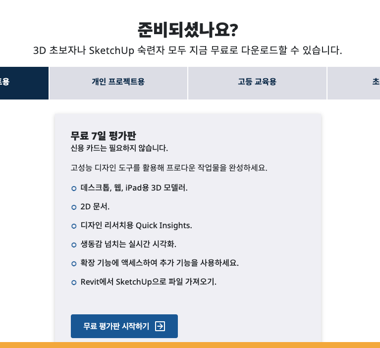 SketchUp Pro 설치형 버전의 7~30일 무료 체험판을 활용해보세요.